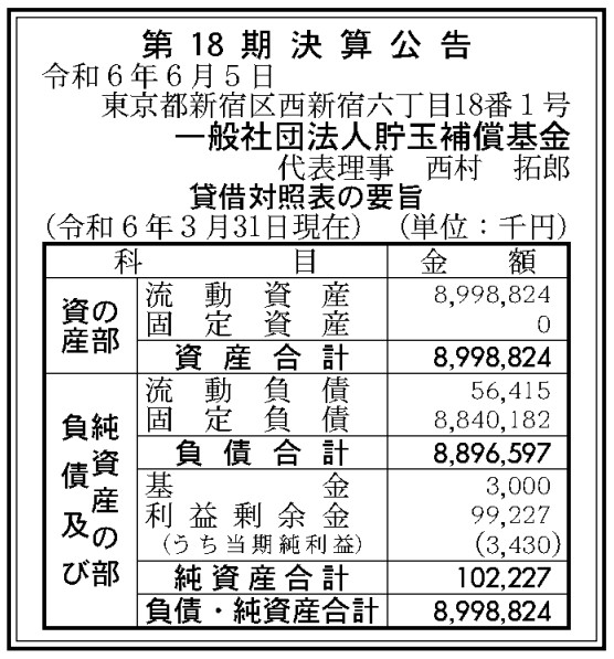 第19期の決算内容を下記のとおり官報にて公告しました。