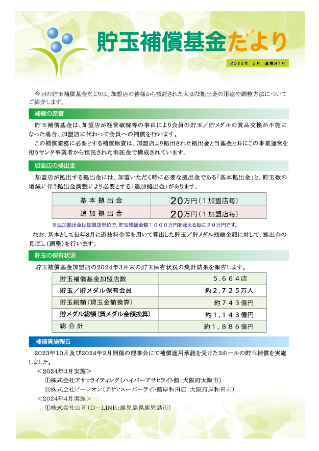 貯玉補償基金は、加盟店が経営破たん等の事由により、会員の皆様から預かっている貯玉/貯メダルの払い戻しが不能となった場合に会員の皆様の貯玉/貯メダルを補償します。
